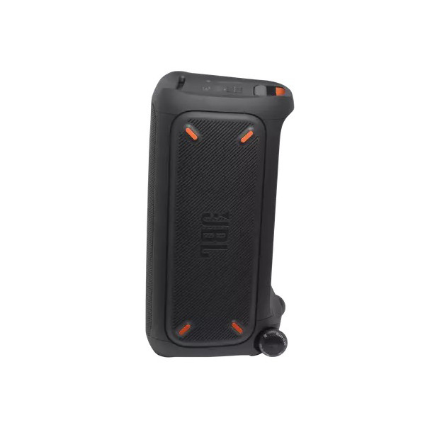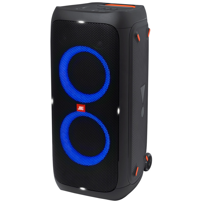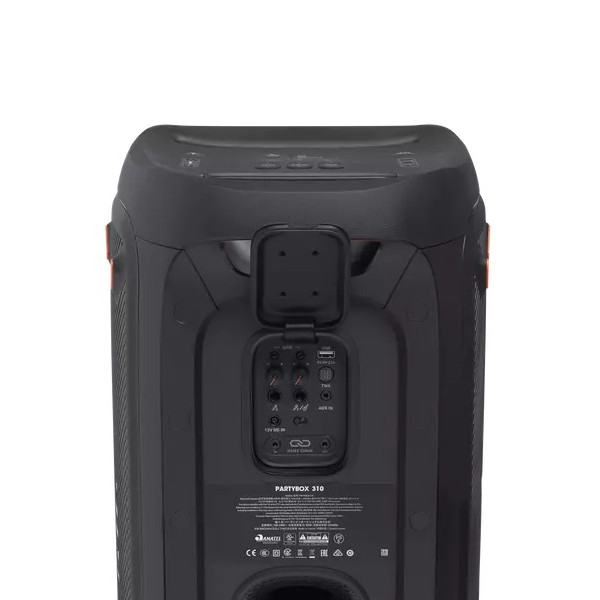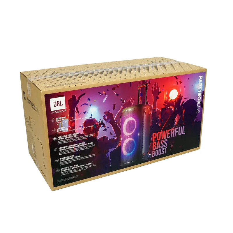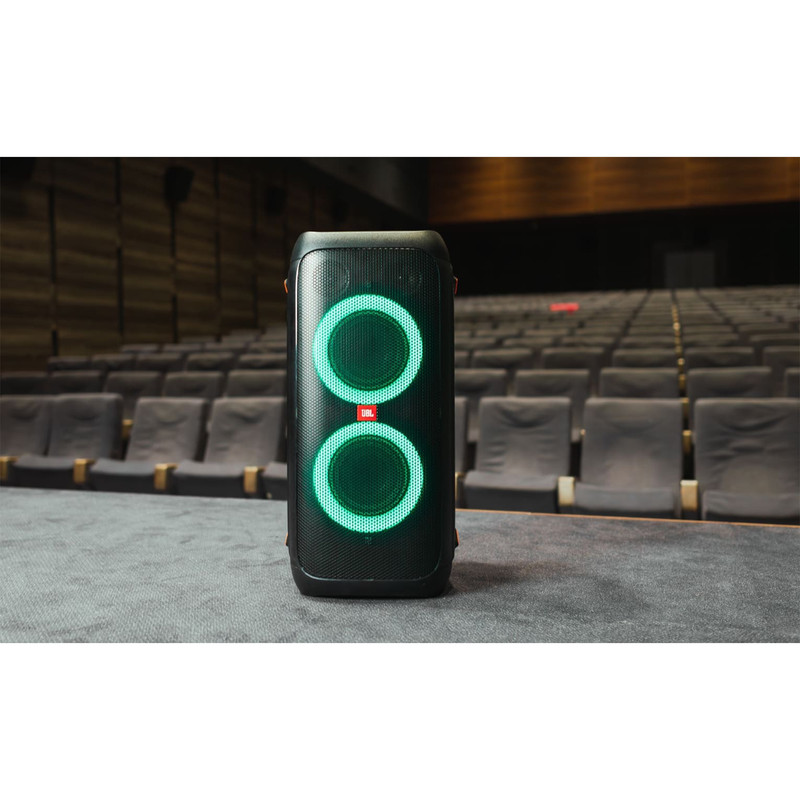 اسپیکر بلوتوثی پارتی باکس 310 یکی از جدیدترین محصولات کمپانی جی بی ال است که با مجهز بودن به درایورهای حرفهای، برای استفاده در محیطهای بزرگ عالی عمل میکند. پارتی باکس JBL 310 با ویژگیهای مثبتی چون قابلیت اتصال به بلوتوث، رقص نور خیرهکننده هماهنگ با موسیقی، باتری پرقدرت و قابلیت حمل آسان در میدان بسیار خوش درخشیده است. با توان خروجی بالا و باس قویای که این اسپیکر دارد، موسیقی را با کیفیت بالا پخش میکند. این اسپیکر حرفهای پرتابل از اتصالات مختلفی مانند بلوتوث، پورت USBو ورودی AUX پشتیبانی میکند و قابلیت کار هم با شبکه برق و هم با باتری را داراست. ناگفته نماند که قیمت جی بی ال ۳۱۰ با داشتن این ویژگیها بسیار مناسب است. عملکرد اسپیکر بلوتوثی جی بی ال 310 در انواع موسیقی کمنظیر است. با وجود قابلیت تنظیمات EQ متعددی هم که در آن وجود دارد، تجربه فوقالعاده از پخش موسیقی را برای شما فراهم میکند. باتری اسپیکر پارتی باکس ۳۱۰ عملکرد فوقالعادهای دارد به طوری که طی 3 ساعت شارژ شده و میتواند تا ۱۷ ساعت موسیقی پخش کند. البته میزان مصرف باتری این محصول به نوع موسیقی و بلندی حجم صدا هم بستگی دارد. نکته جالب اینجاست که این بلندگو به اسپیکر مشابه هم وصل میشود و با این کار حجم صدای موسیقی بیشتر شده و محدودهی پوشش صدا افزایش مییابد. شرکت سازنده در اسپیکر PartyBox 310 پورت ورودی میکروفون هم در نظر گرفته تا برای اجرا یا گفتوگو هیچ مشکلی نداشته باشید. علاوه بر ورودی میکروفون، دکمه تنظیم ساز گیتار هم در این بلندگو تعبیه شده تا برای اجرا زنده هم بسیار کاربردی باشد.